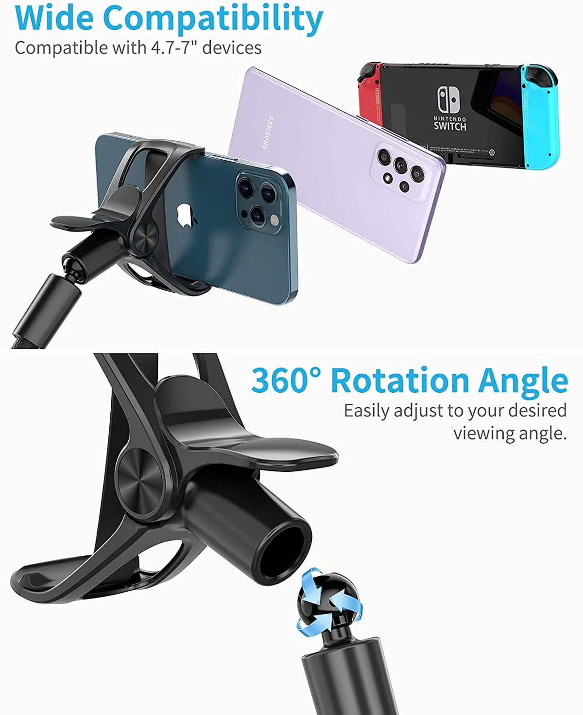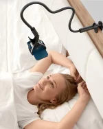 بازوی بلند و منعطف این پایه نگهدارنده، به شما این امکان را میدهد که گوشی را در هر زاویه دلخواه قرار دهید. چه بخواهید در حالت افقی فیلم تماشا کنید، چه در حالت عمودی تماس تصویری داشته باشید، مفصل کروی 360 درجه بهراحتی این تغییر را فراهم میکند.