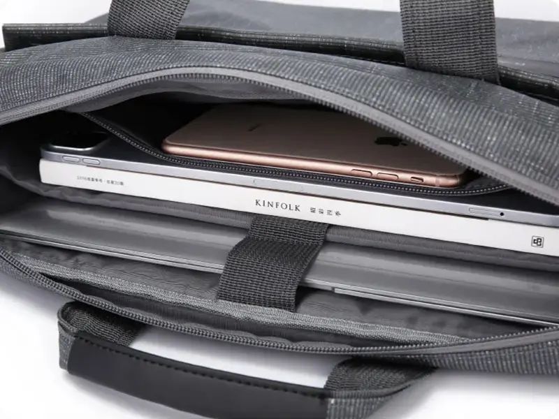 این کیف تنها یک محل برای لپتاپ نیست. طراحی داخلی آن به گونهای است که فضای کافی برای شارژر، موس، دفترچه یادداشت، گوشی و سایر وسایل ضروری شما فراهم شده است. این سازماندهی هوشمندانه باعث میشود وسایل شما مرتب و همیشه در دسترس باشند و دیگر نگران گم شدن یا بهم ریختگی وسایل نباشید.
